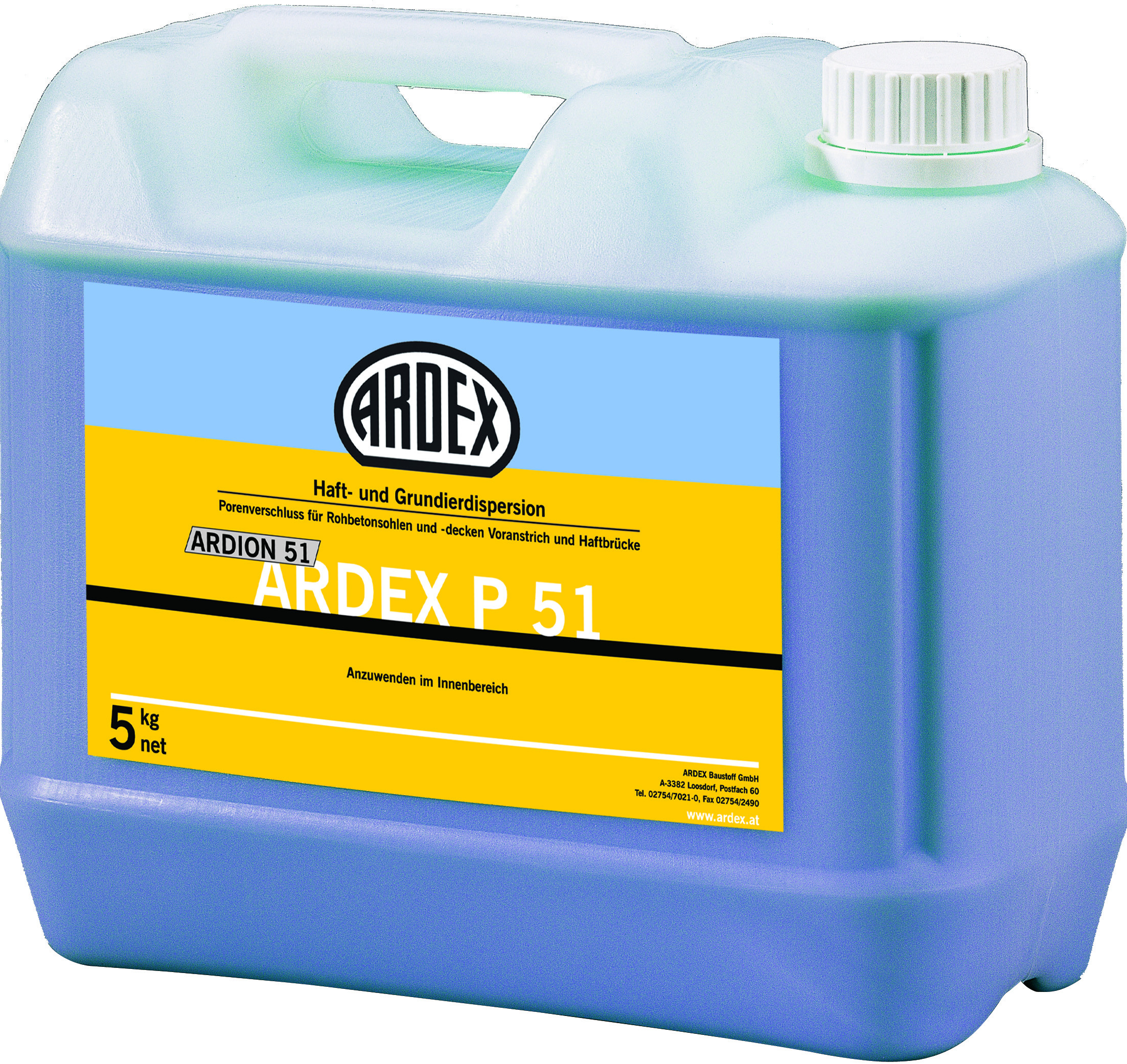 Като грундиране и сцепителен мост върху плътна и гладка основа около 200 g концентрирана, това са 300 g разредена 1 : 0,5 с вода ARDEX P 51 на m2.