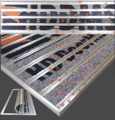 L45 Logo е изработена от алуминиеви профили с вложки, изработени от висококачествена ребро килим с отлични абсорбция на влага и почистващи свойства. L45 Logo премахва прах и влага по най-ефективен начин, и се използва най-вече в интериора райони, насочени към втората и третата зона за фино почистване и контрол на влагата.