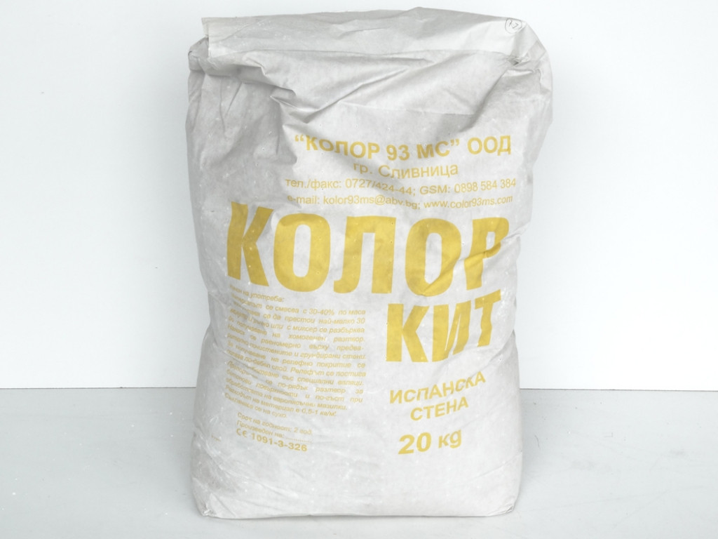 Колор кит е фина декоративна шпакловка за вътрешно приложение на базата на инертни и еколгично чисти материали.