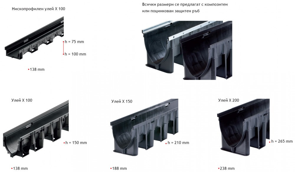 Улеи от композитен материал с ниско тегло Модулна система и аксесоари за лесен монтаж Естетичен дизайн с дискретна слотова решетка Възможност за слот от неръждаема или поцинкована стомана Устойчиви до клас С 250, съгласно БДС EN 1433:2002