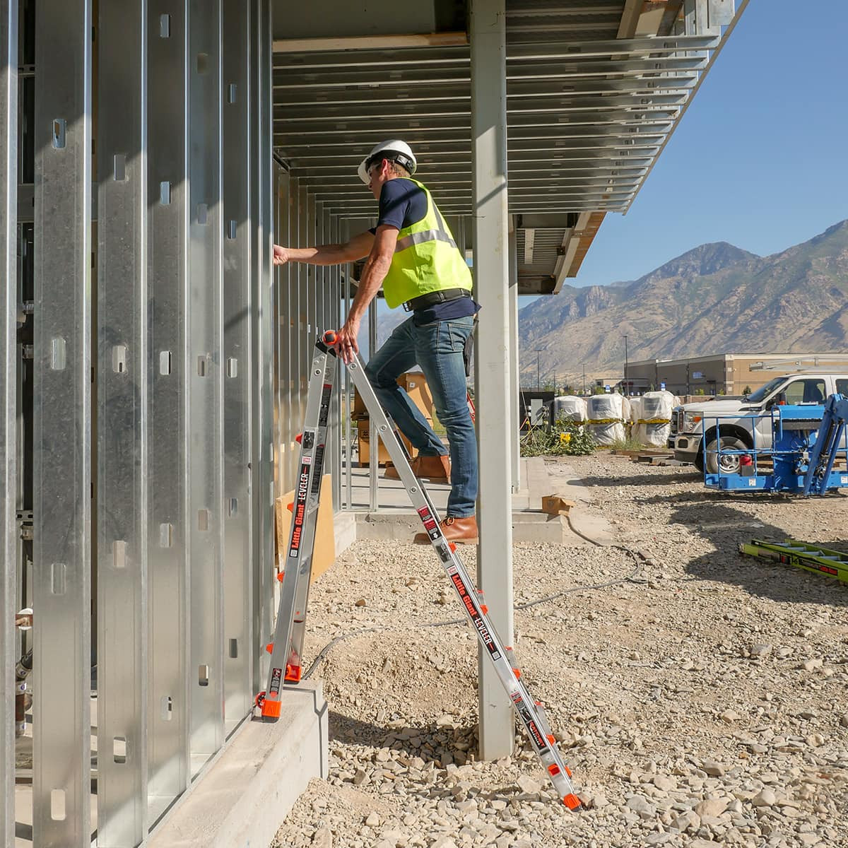 Можете да работите безопасно, дори на неравен терен, благодарение на изцяло новите регулируеми крака Little Giant Ratchet Levelers. Дават възможност за промяна на нивото до 17,5 см.
