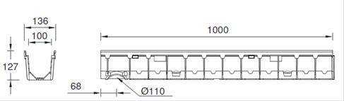 Улей стъклопласт GRP MEAFLUID NW100 композитен ръб височина 127 mm, , L=1000 mm с интегрирани заготвениотвори за вертикално и странично заустване и композитна решетка В125.